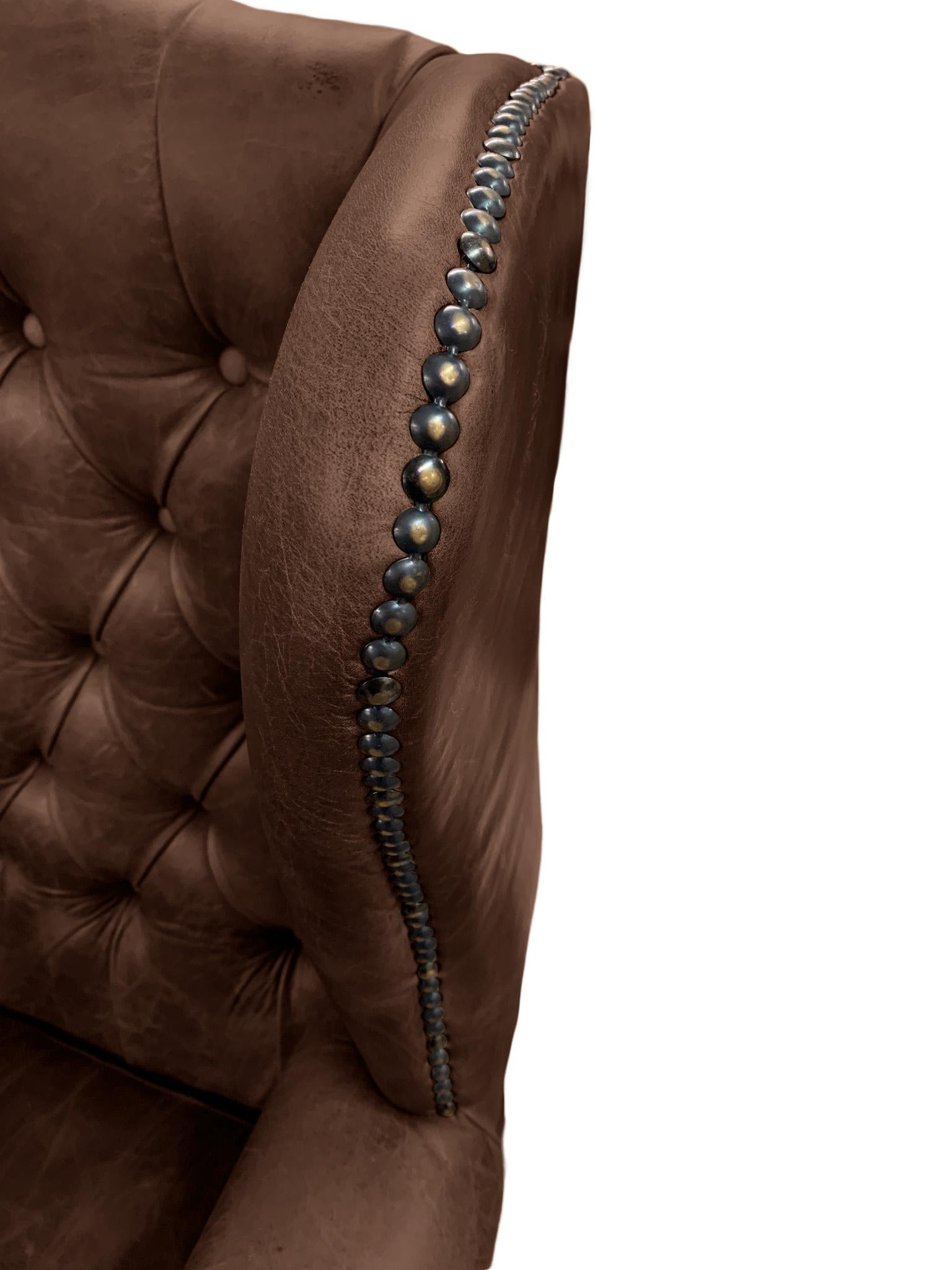 All our chairs are manufactured to order in our workshop based in East Sussex. The frames are made from solid hardwood and are all dowelled, screwed and glued. Unlike most Chesterfield style chairs, we have opened up the wing and made the seat slightly wider and deeper. A common complaint with this style of chair, is the size which can often feel too small and restrictive to be comfortable. All our chairs have a sprung back and sprung base, this is a huge improvement over the standard webbing found on most chairs, meaning our chairs will never look old and saggy and will always give you the comfort and support no matter how much use it gets. All our chairs are finished with a deep buttoned back and antique studding, along with Queen Anne style legs which sets off the genuine vintage style leather beautifully.