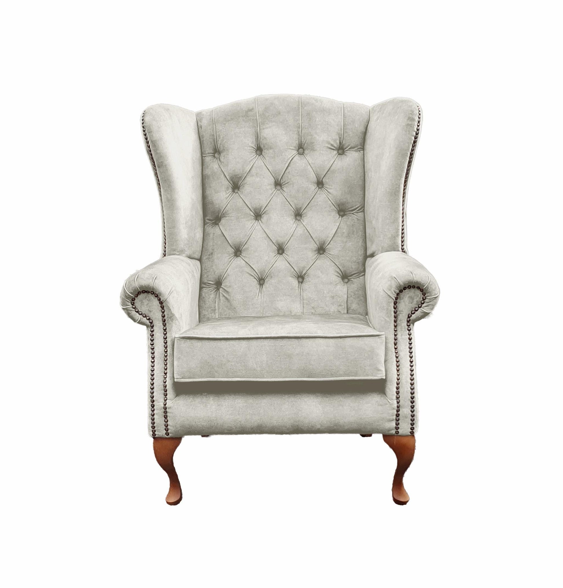 All our chairs are manufactured to order in our workshop based in East Sussex. The frames are made from solid hardwood and are all dowelled, screwed and glued. Unlike most Chesterfield style chairs, we have opened up the wing and made the seat slightly wider and deeper. A common complaint with this style of chair, is the size which can often feel too small and restrictive to be comfortable. All our chairs have a sprung back and sprung base, this is a huge improvement over the standard webbing found on most chairs, meaning our chairs will never look old and saggy and will always give you the comfort and support no matter how much use it gets. All our chairs are finished with a deep buttoned back and antique studding, along with Queen Anne style legs which sets off the luxury velvet style beautifully.