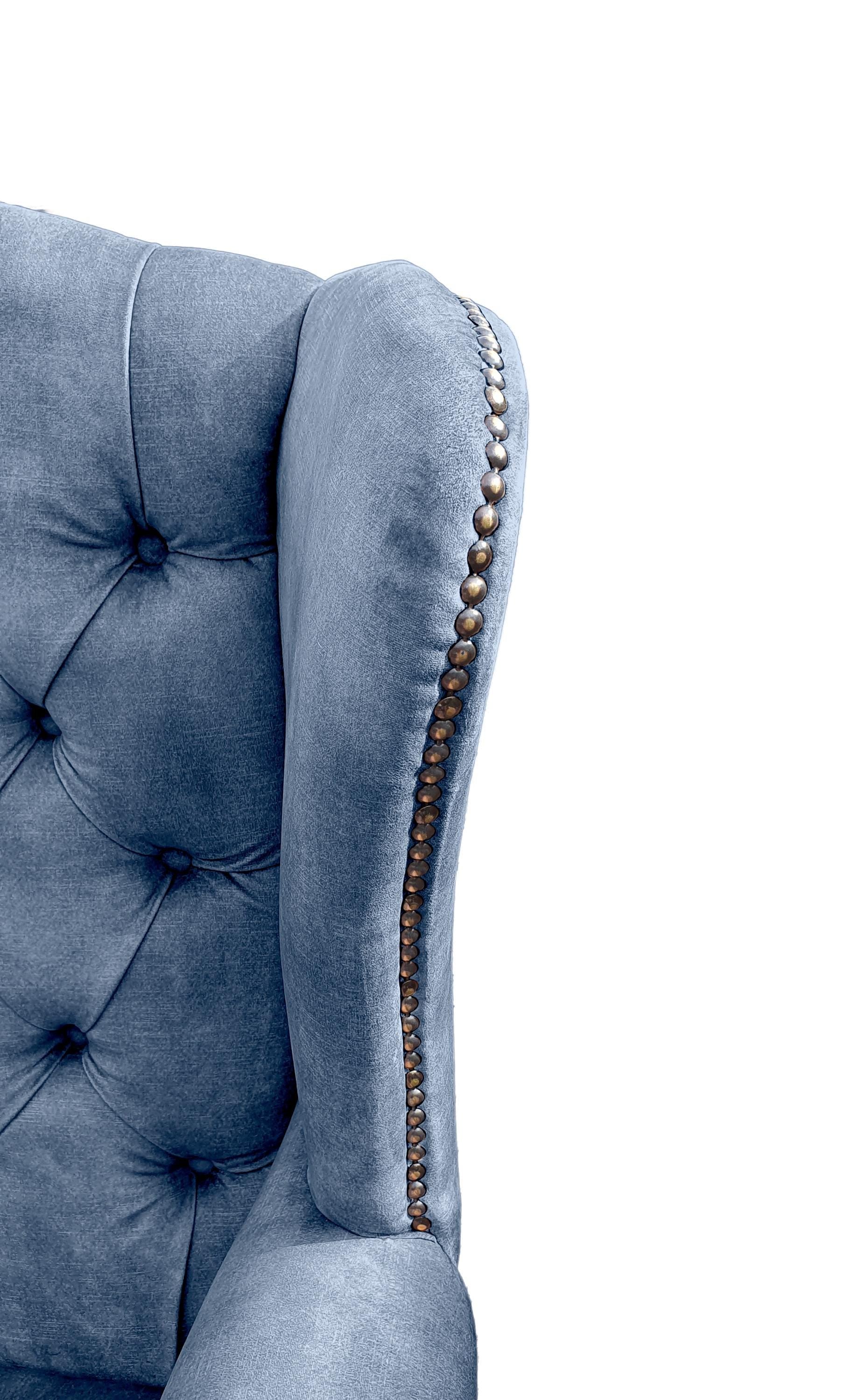 Chesterfield High Back Wing chair and stool - Presented In Luxury Blue Velvet - The Kensington