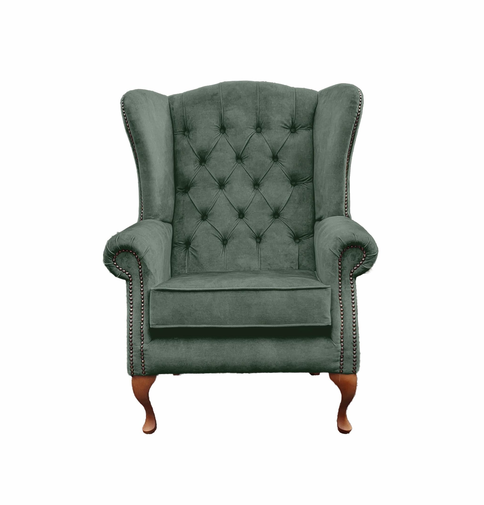 All our chairs are manufactured to order in our workshop based in East Sussex. The frames are made from solid hardwood and are all dowelled, screwed and glued. Unlike most Chesterfield style chairs, we have opened up the wing and made the seat slightly wider and deeper. A common complaint with this style of chair, is the size which can often feel too small and restrictive to be comfortable. All our chairs have a sprung back and sprung base, this is a huge improvement over the standard webbing found on most chairs, meaning our chairs will never look old and saggy and will always give you the comfort and support no matter how much use it gets. All our chairs are finished with a deep buttoned back and antique studding, along with Queen Anne style legs which sets off the luxury velvet style beautifully.