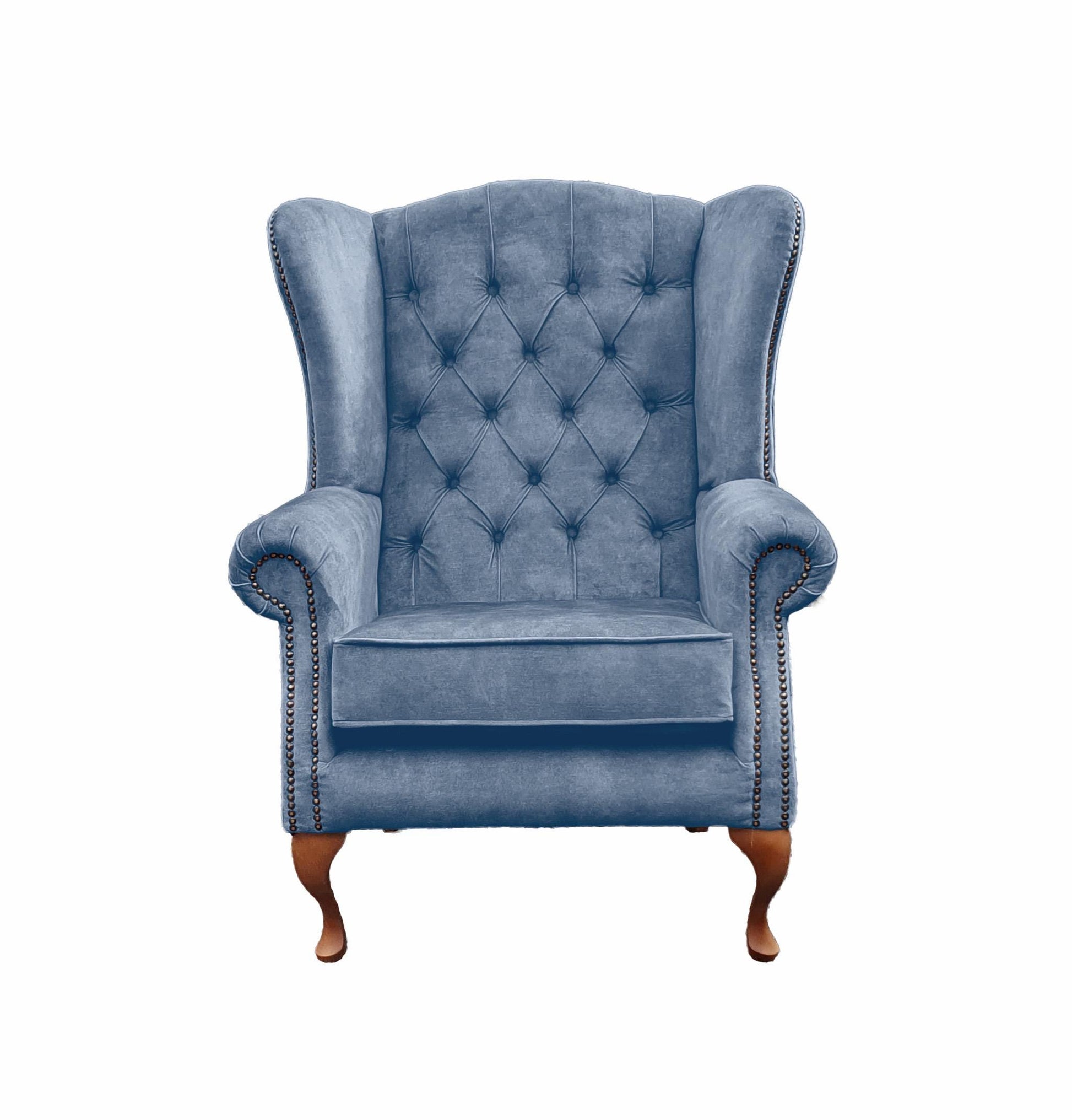 All our chairs are manufactured to order in our workshop based in East Sussex. The frames are made from solid hardwood and are all dowelled, screwed and glued. Unlike most Chesterfield style chairs, we have opened up the wing and made the seat slightly wider and deeper. A common complaint with this style of chair, is the size which can often feel too small and restrictive to be comfortable. All our chairs have a sprung back and sprung base, this is a huge improvement over the standard webbing found on most chairs, meaning our chairs will never look old and saggy and will always give you the comfort and support no matter how much use it gets. All our chairs are finished with a deep buttoned back and antique studding, along with Queen Anne style legs which sets off the luxury velvet style beautifully.