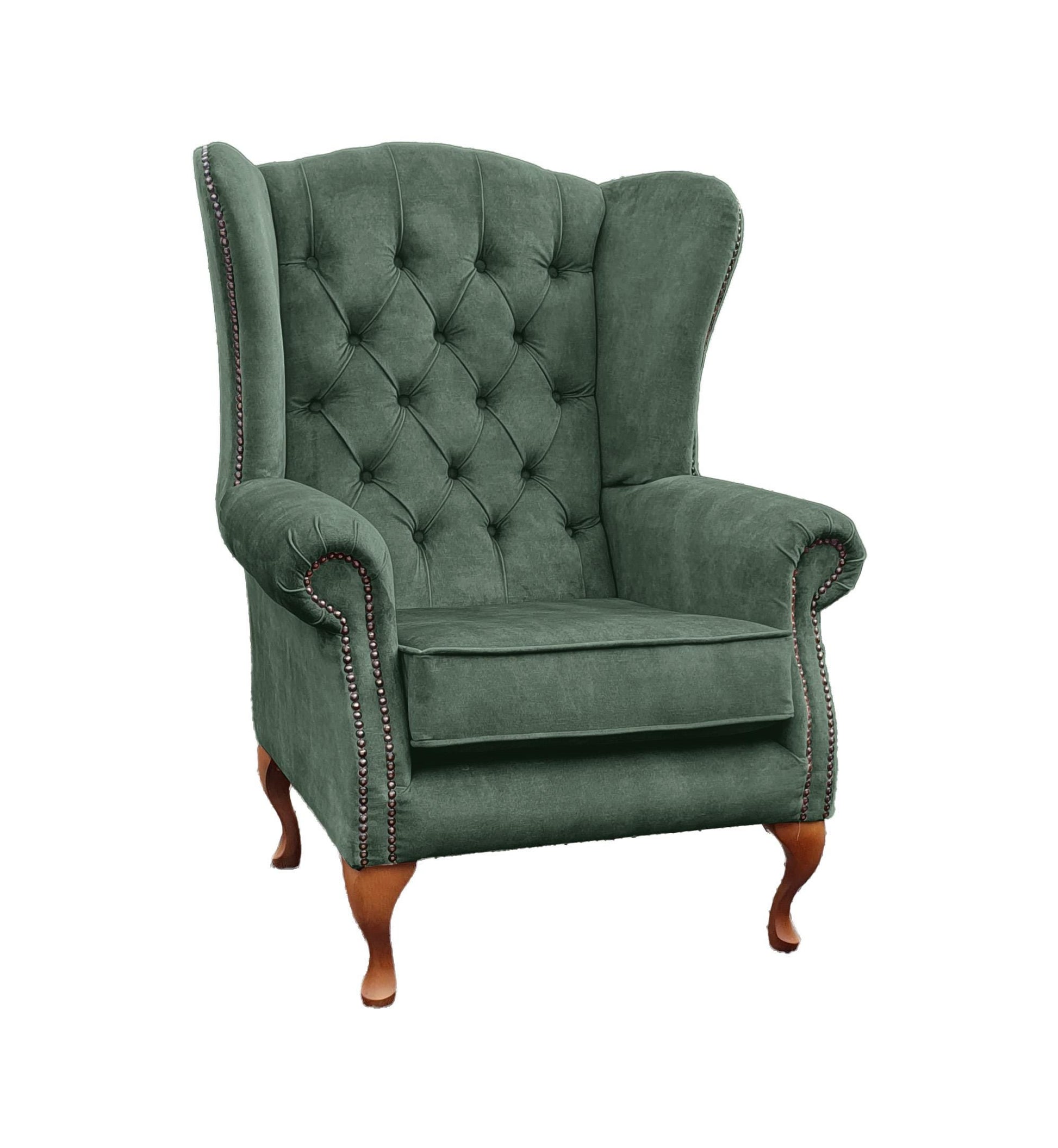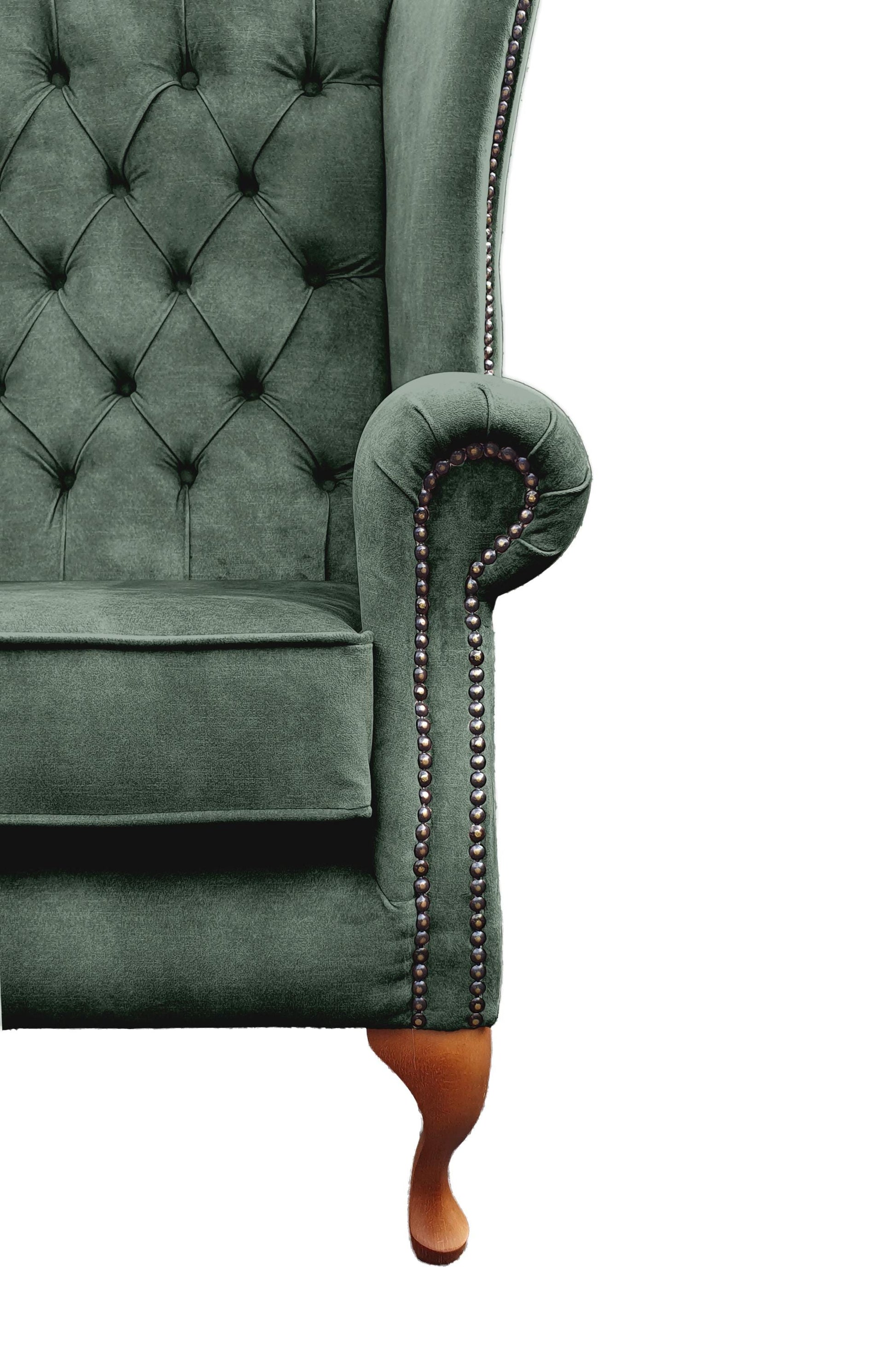 All our chairs are manufactured to order in our workshop based in East Sussex. The frames are made from solid hardwood and are all dowelled, screwed and glued. Unlike most Chesterfield style chairs, we have opened up the wing and made the seat slightly wider and deeper. A common complaint with this style of chair, is the size which can often feel too small and restrictive to be comfortable. All our chairs have a sprung back and sprung base, this is a huge improvement over the standard webbing found on most chairs, meaning our chairs will never look old and saggy and will always give you the comfort and support no matter how much use it gets. All our chairs are finished with a deep buttoned back and antique studding, along with Queen Anne style legs which sets off the luxury velvet style beautifully.